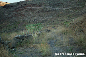 Después de casi dos kilómetros de persistente y cansante ascenso, pasaremos a transitar sobre una superficie de cemento, que en unos quinientos metros nos deja en una explanada donde se alzan varias antenas de telecomunicaciones; a partir de aquí comienza una pista de tierra que se dirige, sin dejar de ascender, a rodear la Montaña de Anocheza (1069 m.), donde se encuentra otro complejo de antenas y diferentes estructuras de telecomunicaciones; continuamos unos metros junto a unos Pinos Canarios (Pinus canariensis) que comparten espacio en el borde del camino con algunos Brezos (Erica arborea), e ignoraremos la pista forestal principal y otra desviación a la izquierda que se dirige hacia la Morra los Carboneros y comenzaremos a ascender por el empinado y escondido sendero que sube en fuerte pendiente hacia las antenas. La vereda es bastante precaria, ya que la abundante vegetación ha taponado el trazado original del camino, discurre entre multitud de Jaguarzos (Cistus monspeliensis), Vinagreras (Rumex lunaria), Tederas (Bituminaria bituminosa), Cornicales (Periploca laevigata) y algunas Cerrajas (Sonchus acaulis) y en ocasiones va junto a unos muretes de piedra seca pertenecientes a antiguas huertas de cultivo, donde crecen algunos Bejeques (Aeonium arboreum).