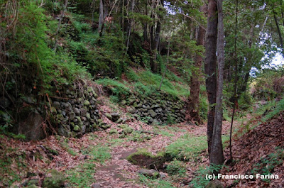 El sendero continúa en descenso y pasa junto a unas eras de trilla, que apenas se distinguen por estar cubiertas de vegetación y que pertenecen a otra casa rural, situada cerca del camino y en completo abandono; luego sigue con algunos tramos empedrados, junto a unas tuberías de abastecimiento de agua y siempre nos guiaremos por los viejos muros de piedra seca que separaban el sendero de las huertas contiguas.